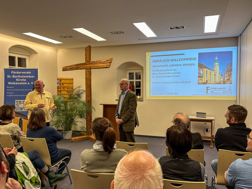 Kirche: Den Auftakt unserer Öffentlichkeitsarbeit bildete am 3. Februar 2025 ein Gemeindeabend mit Matthias Haase und Horst Gerlach zur Geschichte und baulichen Entwicklung der St.-Bartholomäus-Kirche Wolkenstein. Mit über 50 Besuchern fand das Thema des Abends eine sehr gute Resonanz.