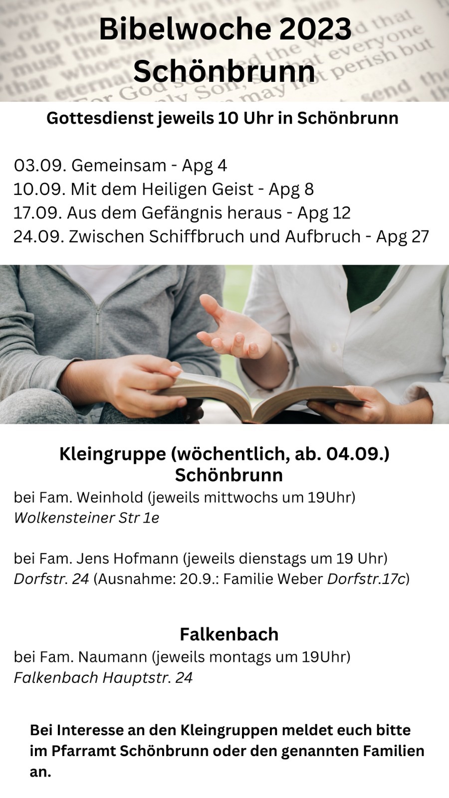 Im Monat September möchten wir uns intensiv mit der Apostelgeschichte beschäftigen. Jede Predigt in Schönbrunn befasst sich im September mit einem Text aus der Apostelgeschichte. Zusätzlich treffen wir uns jede Woche in Kleingruppen für spannende Gespräche und gemeinsames Bibellesen.