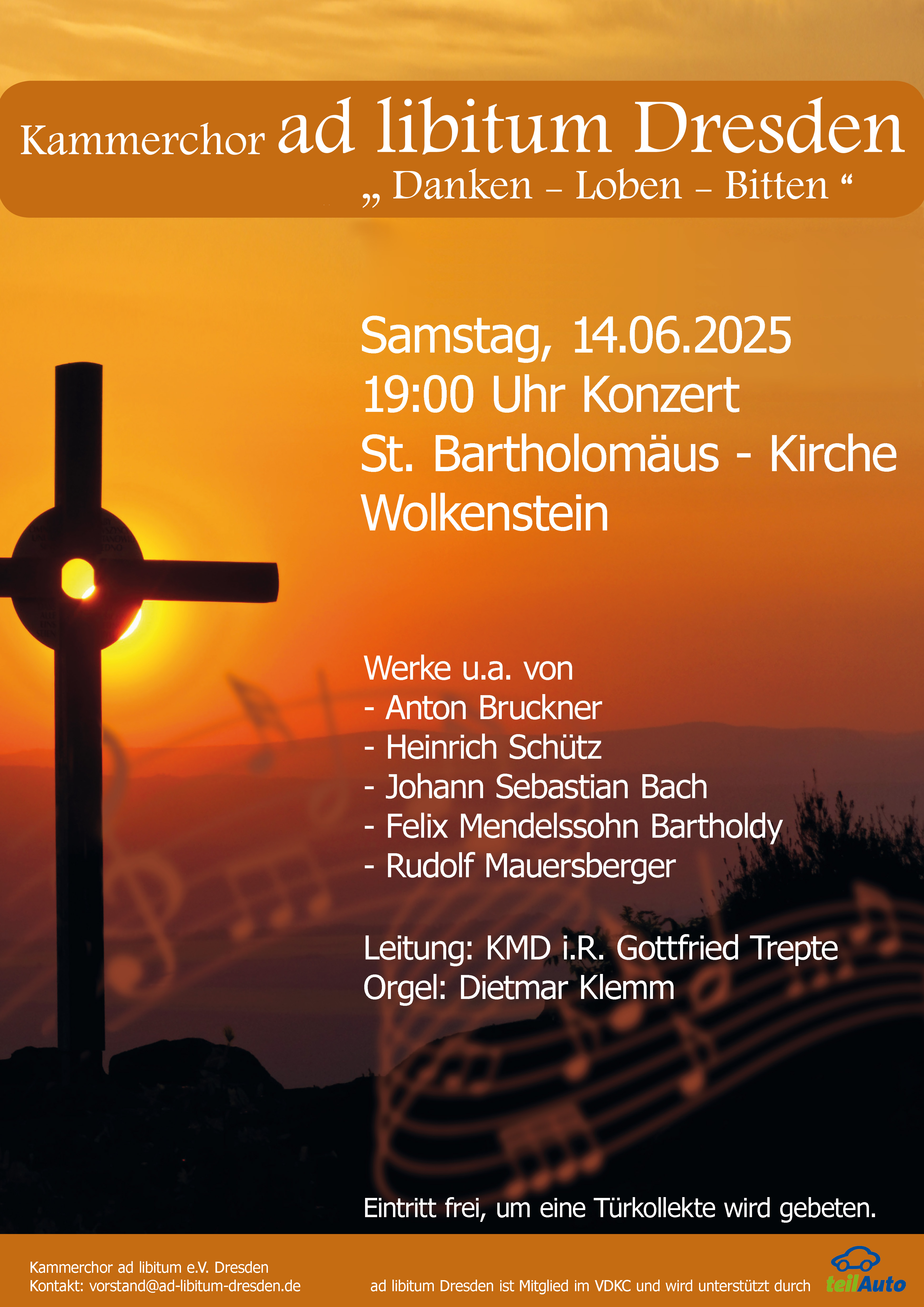 Im Benefizkonzert am 14. Juni in der St.-Bartholomäus-Kirche werden u. a. Werke von Anton Bruckner, Heinrich Schütz, Johann Sebastian Bach, Felix Mendelssohn Bartholdy und Rudolf Mauersberger zur Aufführung gelangen. Die Begleitung des Chores an der Christian Gottlob Steinmüller-Orgel wird in bewährter Weise durch den Wolkensteiner Kantor Dietmar Klemm erfolgen.