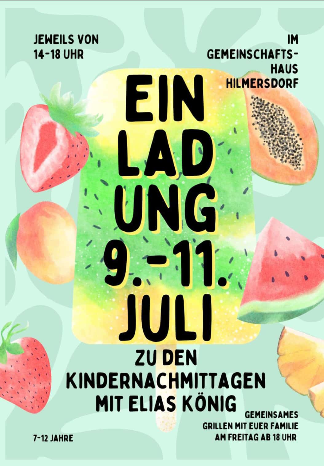 Am Freitag, dem 11. Juli 2025, findet ab 18 Uhr ein gemeinsames Grillen mit der ganzen Familie statt.