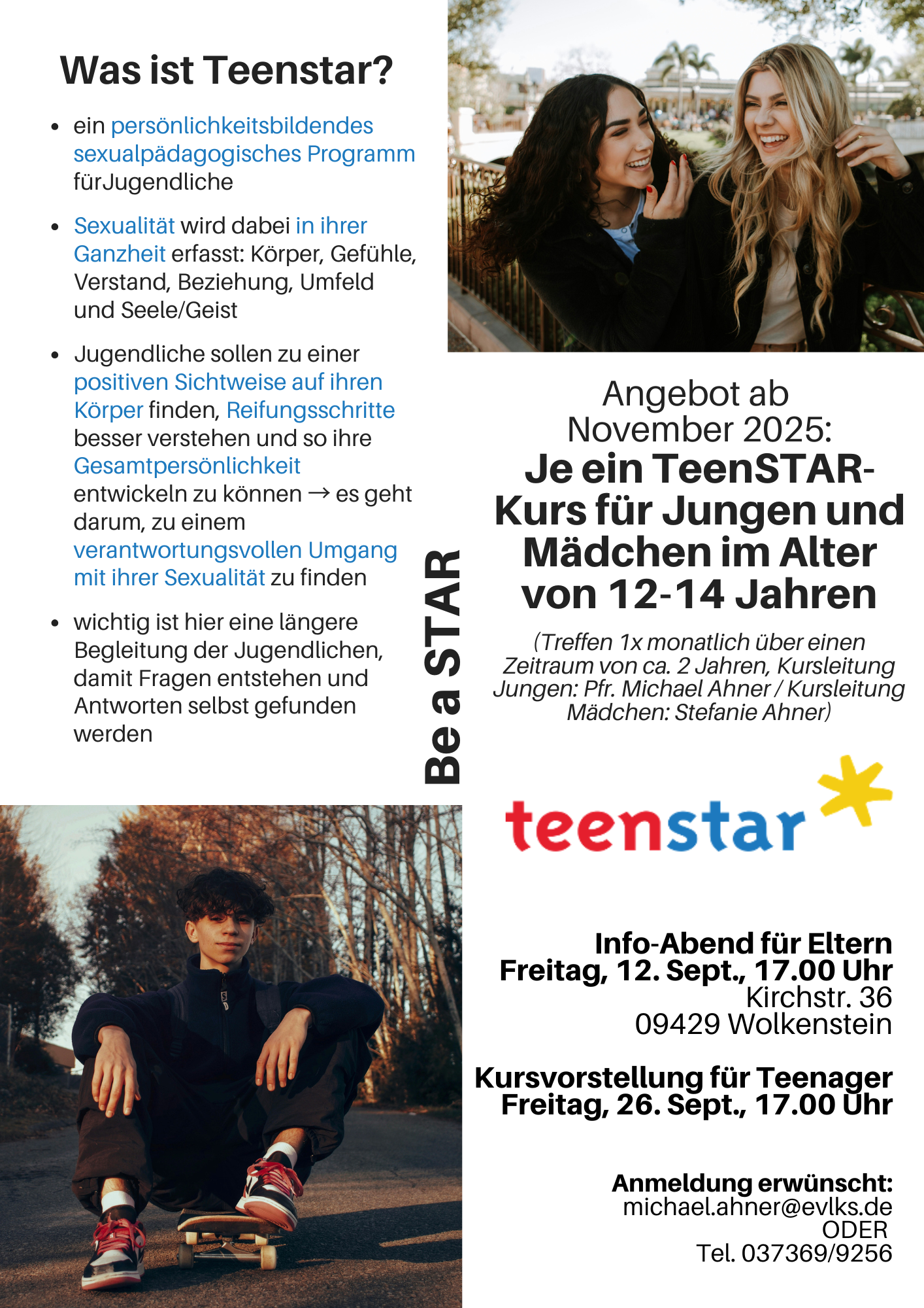Im November 2025 beginnt je ein TeenSTAR-Kurs für Jungen und Mädchen im Alter von 12 bis 14 Jahren (weitere Informationen).