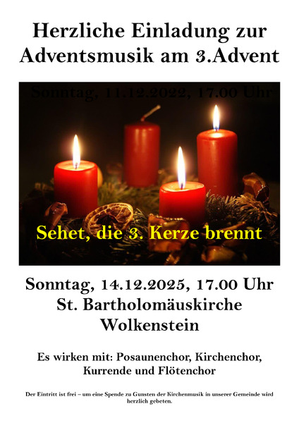 „Sehet, die 3. Kerze brennt“ – Herzliche Einladung zur Adventsmusik am 3. Advent